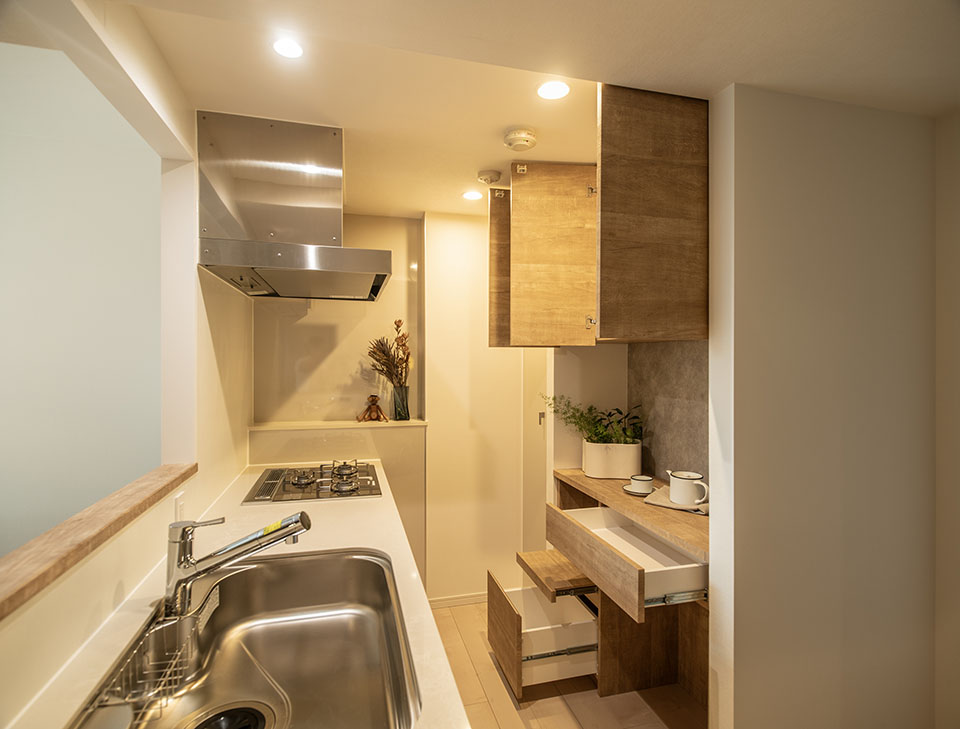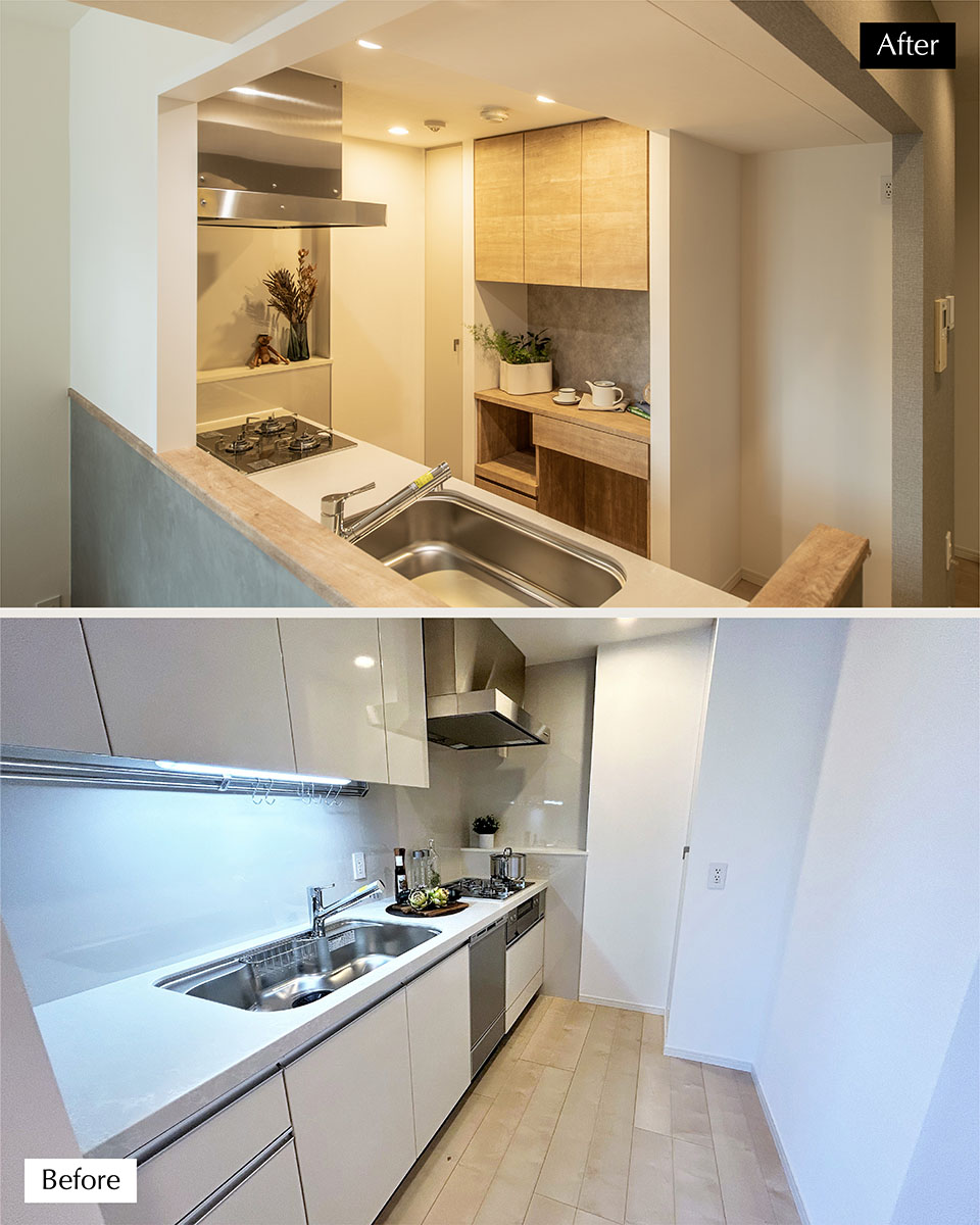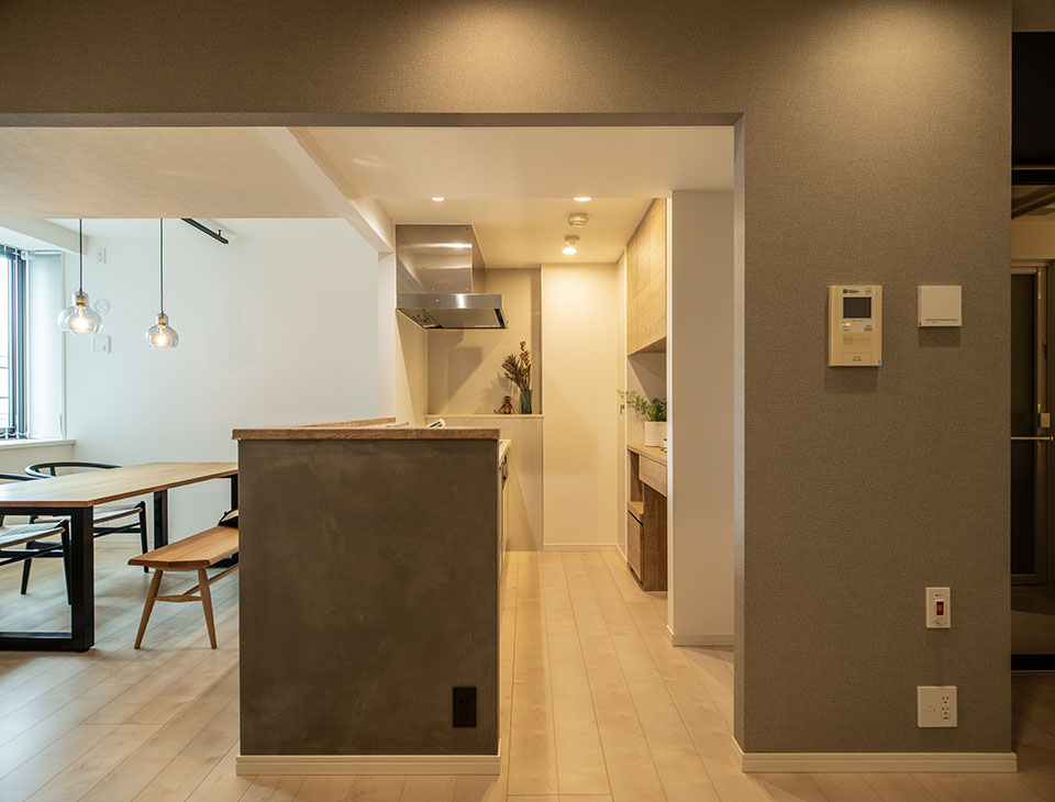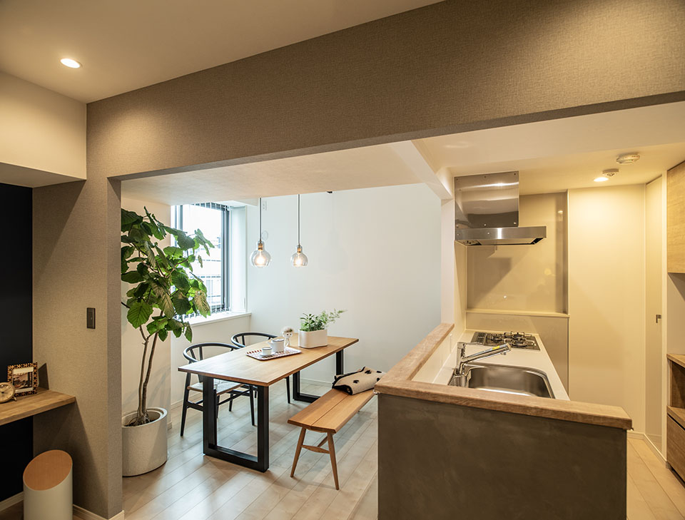 リビングに入った時にできるだけ開放感を感じられるよう、リビングダイニング横の部屋の壁を取り払いひとつの空間に。キッチンの壁も一部取り除いてオープンな空間に仕上げました。