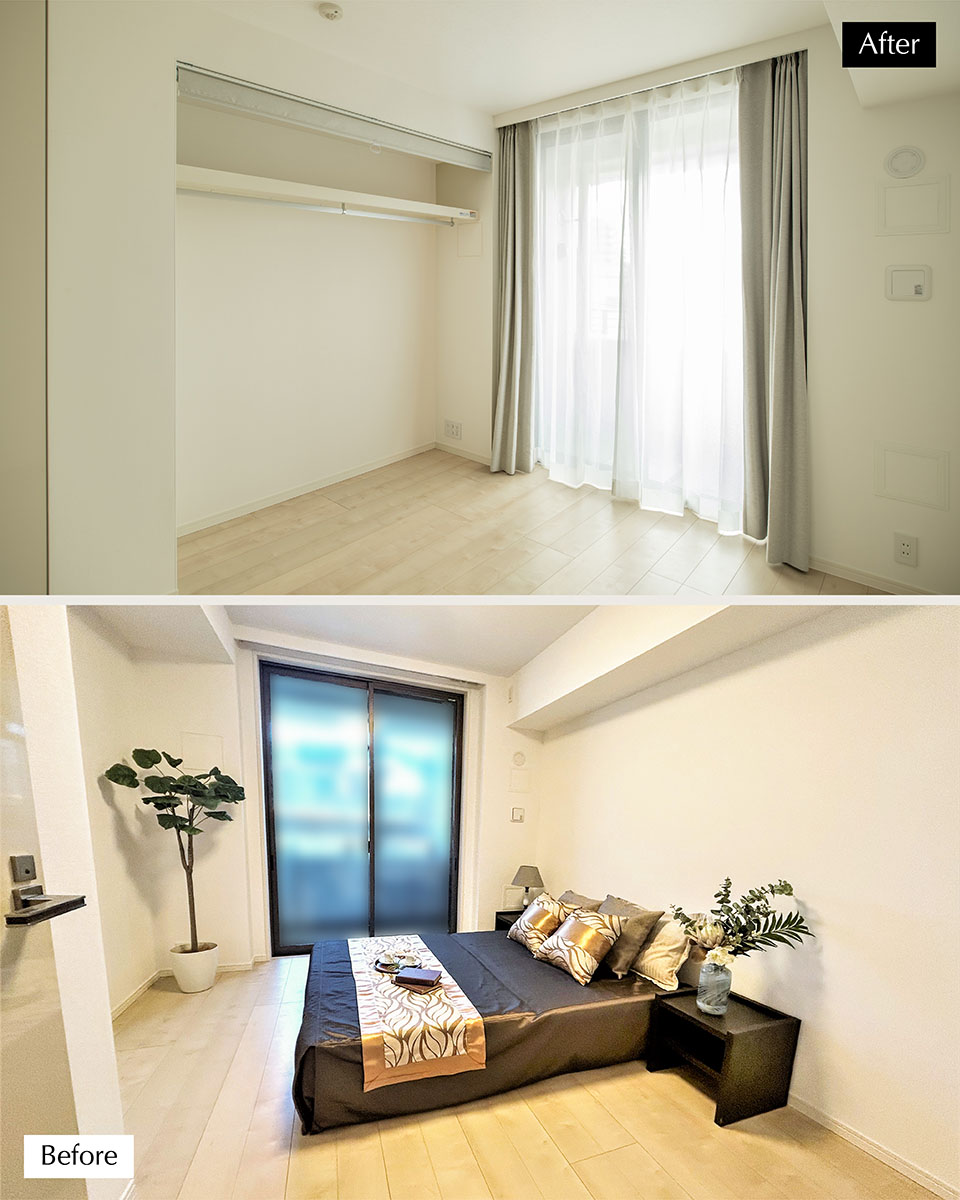 寝室はほとんど変えていませんが、壁の窪んだ空間を利用して衣類などをしまえる収納スペースとしました。
