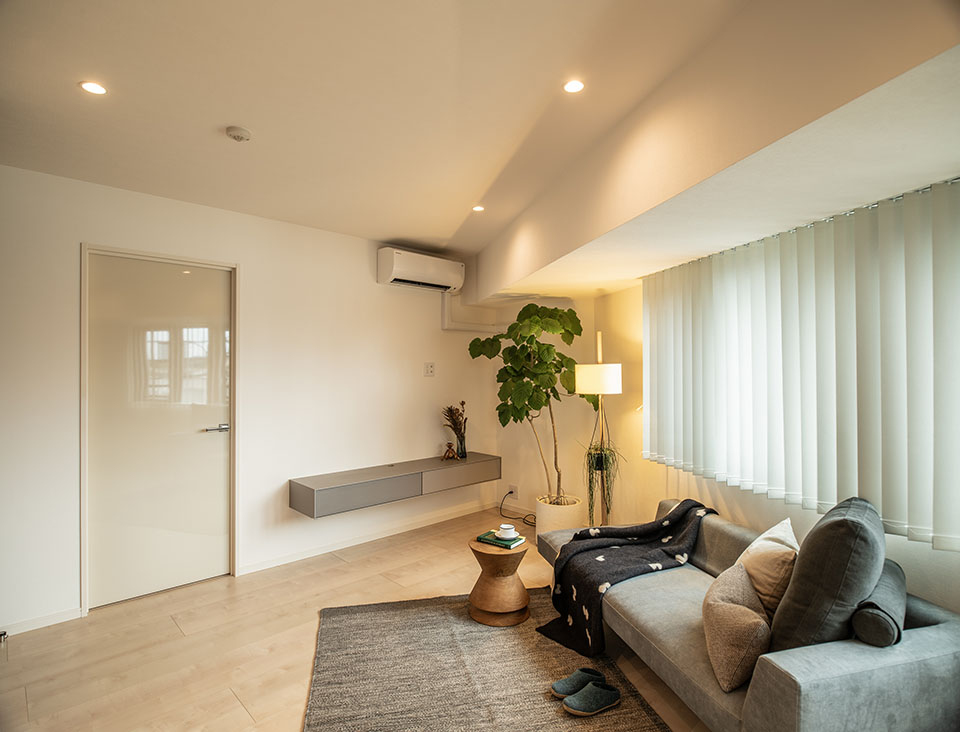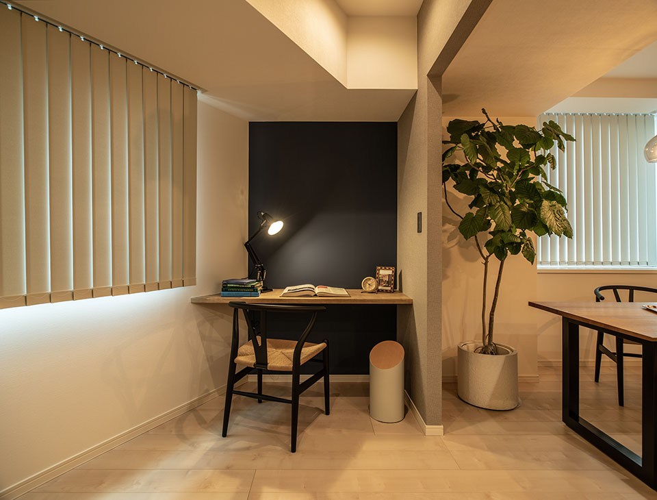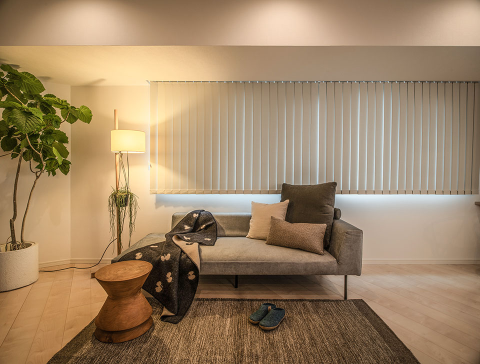 窓周りには縦型のバーチカルブラインドを採用し、ボリューム感を抑えることで空間を広く見せる視覚効果もあります。