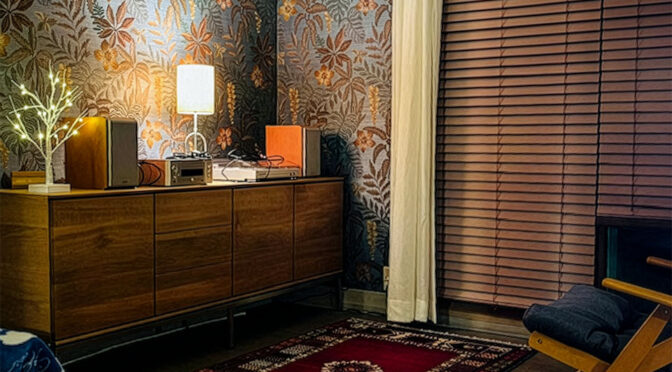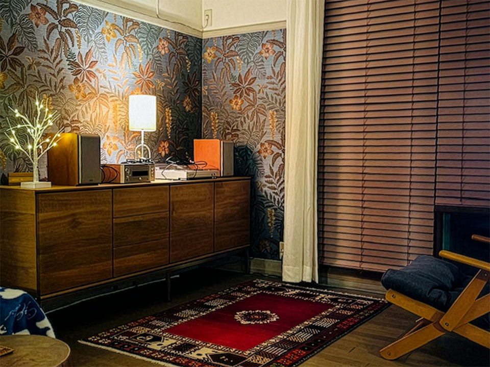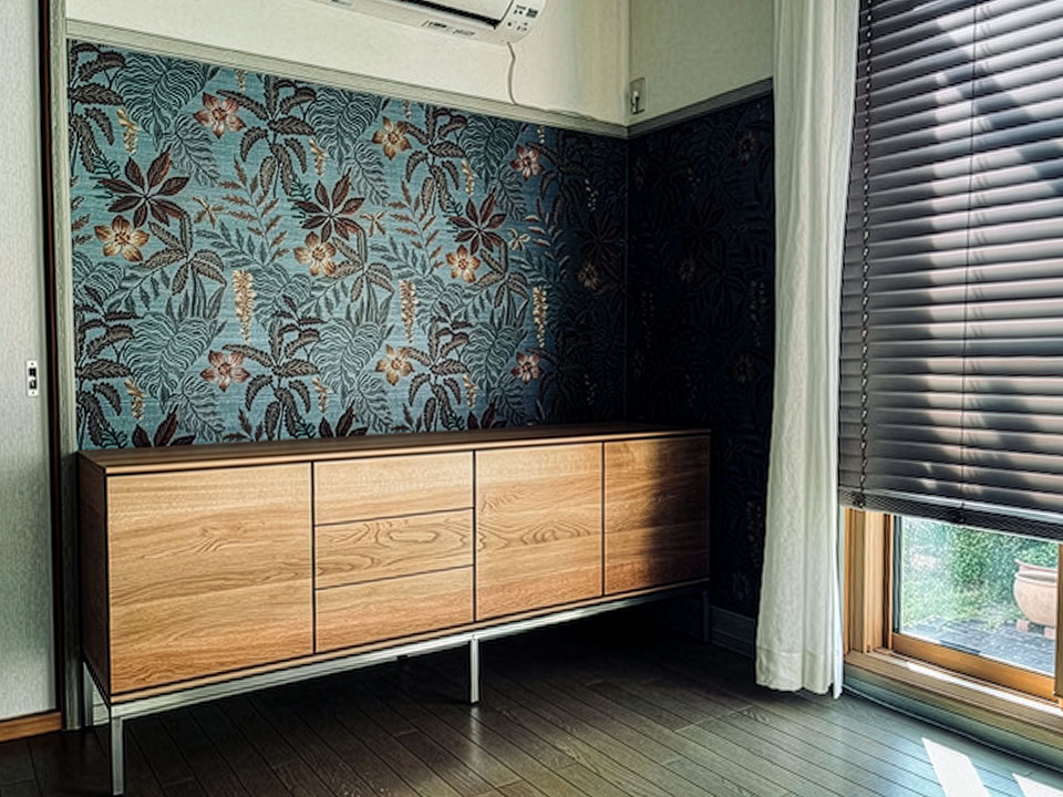 存在感のある壁紙に、木のあたたかみを感じるサイドボードがよく馴染み、空間全体が自然とまとまっています。