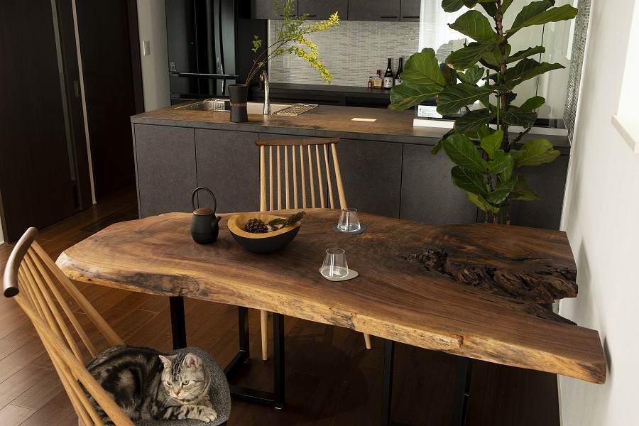 それまでは比較的手頃なテーブルを使われていましたが、使っているうちに安定感がなくなり、買い替えが必要になることもあったそうです。「一枚板は買い替えるものではなく、一緒に歩んでいくもの」長く使い続けられる家具として、一枚板を選ばれました。