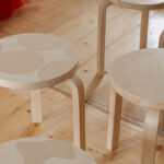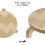 アルヴァ・アアルトが1933年にデザインした「スツール 60」。アルテックを象徴するデザインのひとつであり、スツールとして、サイドテーブルとして、ディスプレイ台として、 あらゆる使い方ができる汎用性があります。今回はartek90周年をお祝いして、マリメッコと協働した、マリメッコのプリント作りのアートと、アルテックの曲げ木の技術の融合による限定のアアルト家具が発表されました。期間限定での生産となります。