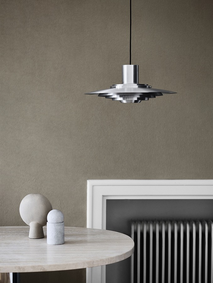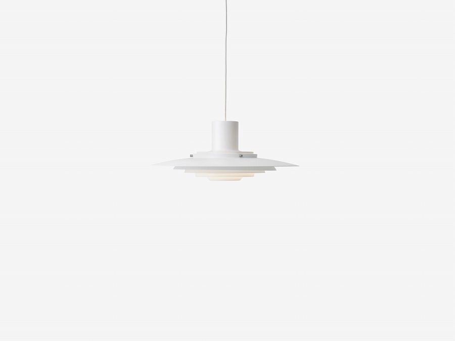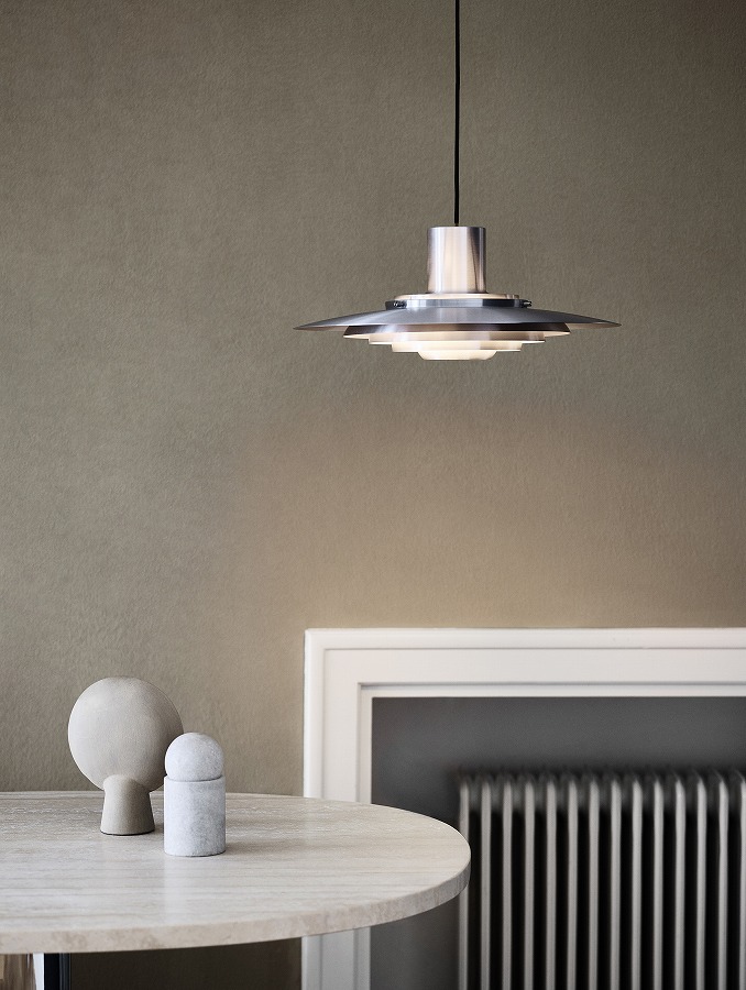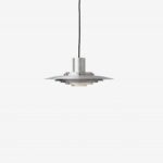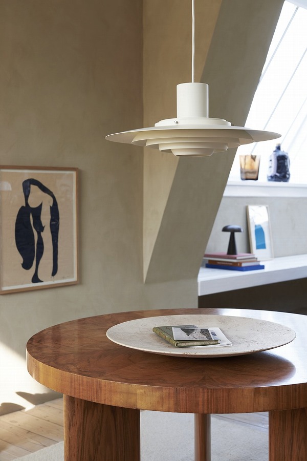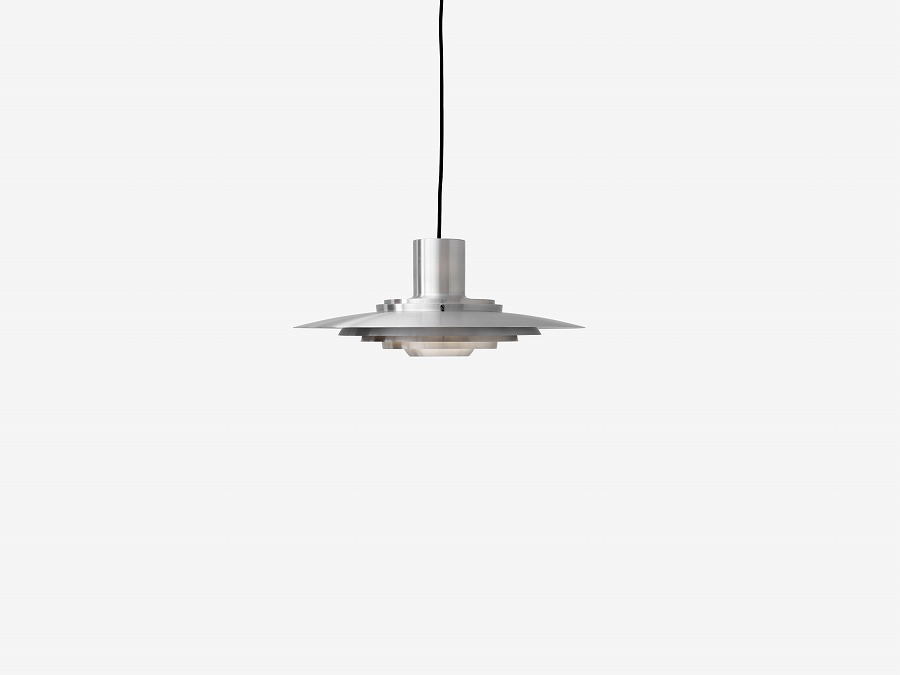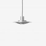1963年に考案されたこのペンダントランプは、5つの同心円状のシェードがランプの中央に向かってカーブのグラデーションを描き、柔らかく拡散した光を放ちます。