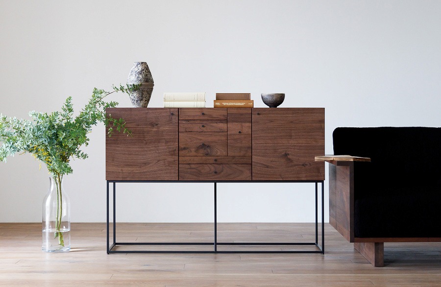 天然木の木目の美しさが高級感を演出し、シックで洗練されたお部屋に。シャープなフォルムのスチール脚をあえて高めに仕上げる事により、より一層空間を広く見せる効果もあります。